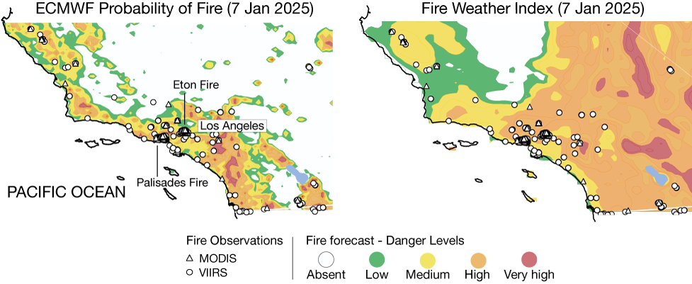 Traditional fire danger indices often fail to clearly identify areas at risk of ignition, relying solely on weather conditions to assess fire risk. While they are excellent at highlighting broad regions of concern, they tend to over-predict fire occurrence and fail to provide the precision needed for targeted action. This was the case during the Los Angeles fires, where critical fire weather conditions were flagged across a wide area using traditional fire weather forecasts (EFFIS/GWIS), but these lacked the specificity to identify ignition hotspots. ECMWF’s new data-driven fire danger model, the Probability of Fire (PoF), is designed to go beyond using just weather (Figure 3).