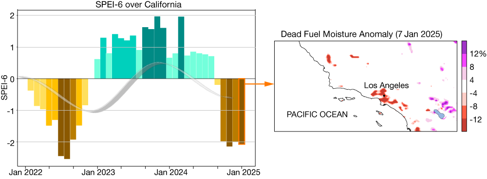 Figure 1: Timeseries of the Standardised Precipitation Evapotranspiration Index (a drought index) with a 6-month accumulation period (SPEI-6) over southern California since January 2022 (left-hand panel), indicating the hydroclimate whiplash effect that led to high fuel load and caused particularly low dead fuel moisture content in some areas around Los Angeles at the beginning of January 2025 (the right-hand panel shows the dead fuel moisture anomaly). The drought index is calculated using ERA5, and the total fuel load and dead fuel moisture anomaly are outputs from ECMWF’s fuel model, SPARKY.