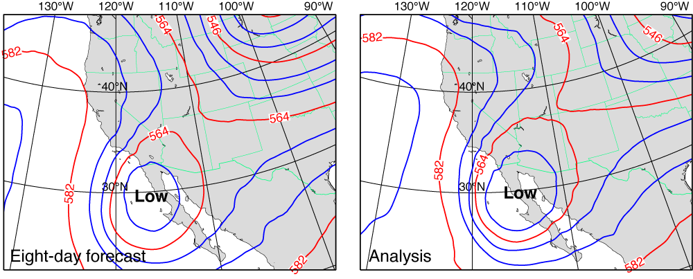 Figure 2: Forecast from 12 UTC on 31 December 2024 of the upper-level weather pattern (here the 500 hPa geopotential height from the control run, in decametres) for 12 UTC on 8 January 2025 (left) against the verifying analysis (right).